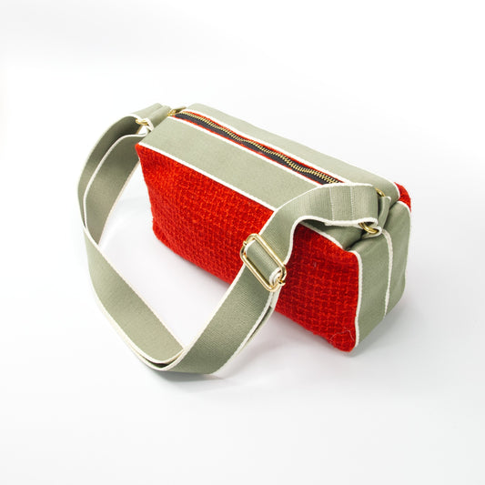 Il tessuto senza tempo, denso di riflessi e raffinatezza, richiama l’universo dell’alta moda ma, a rompere lo schema, arriva un dettaglio sorprendente: il nastro bicolore cangiante che con il suo allure sixties e la sua anima grafica, porta leggerezza e ironia. Un tocco pop che rilancia.