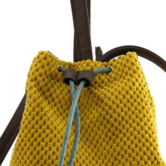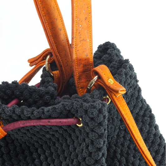 Borsa a secchiello in velluto operato e sughero, con manico e tracolla. Fondo rigido, profilo in contrasto, tasca interna e fodera floreale.