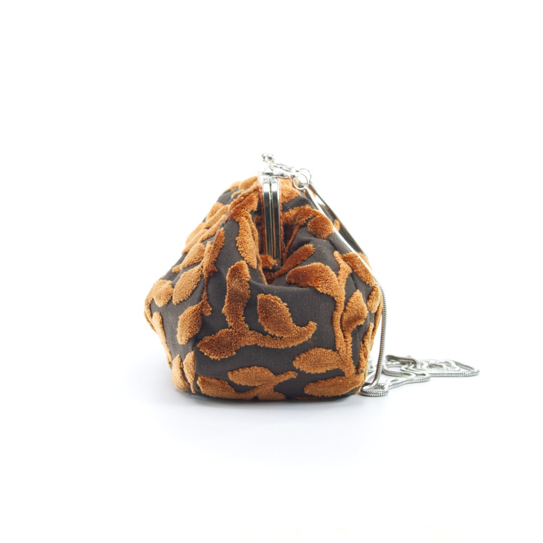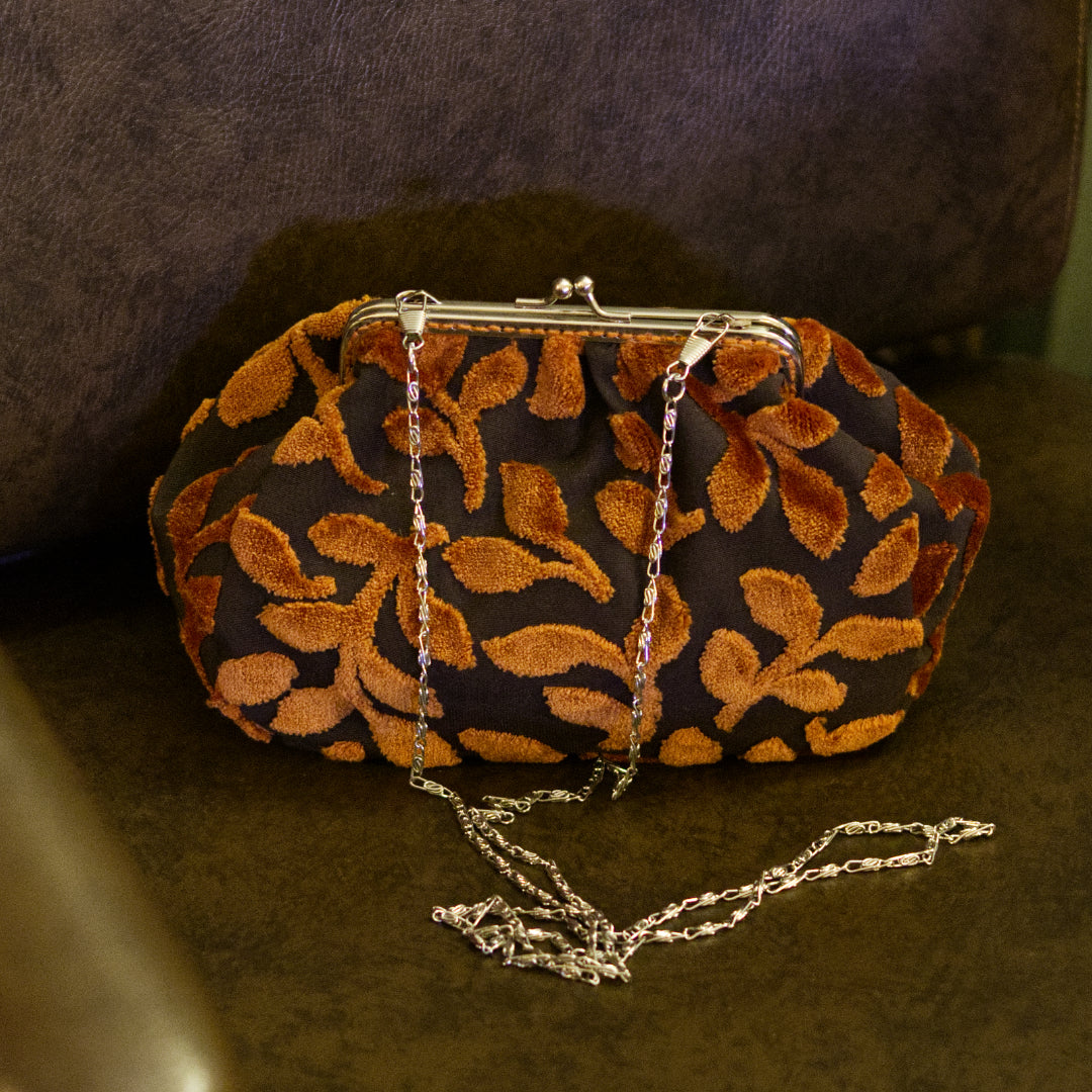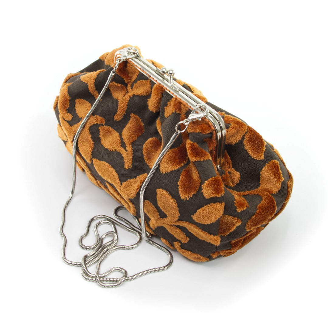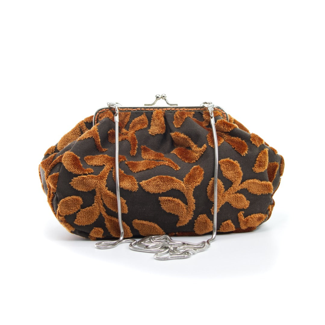 Chiusura kiss-lock argentata, tessuto con rami stilizzati arancio in rilievo su fondo castagna.
