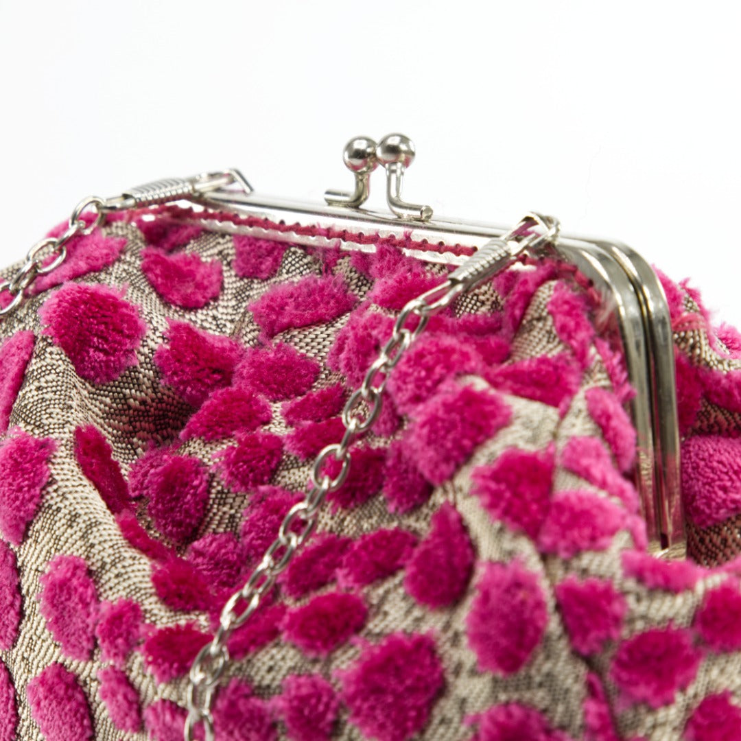 Chiusura kiss-lock argentata, tessuto con pois irregolari fucsia in rilievo su fondo argento lamè.