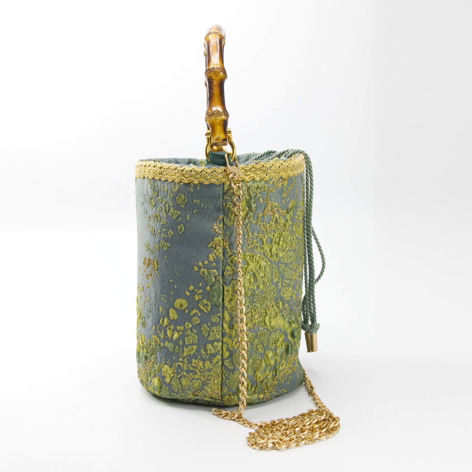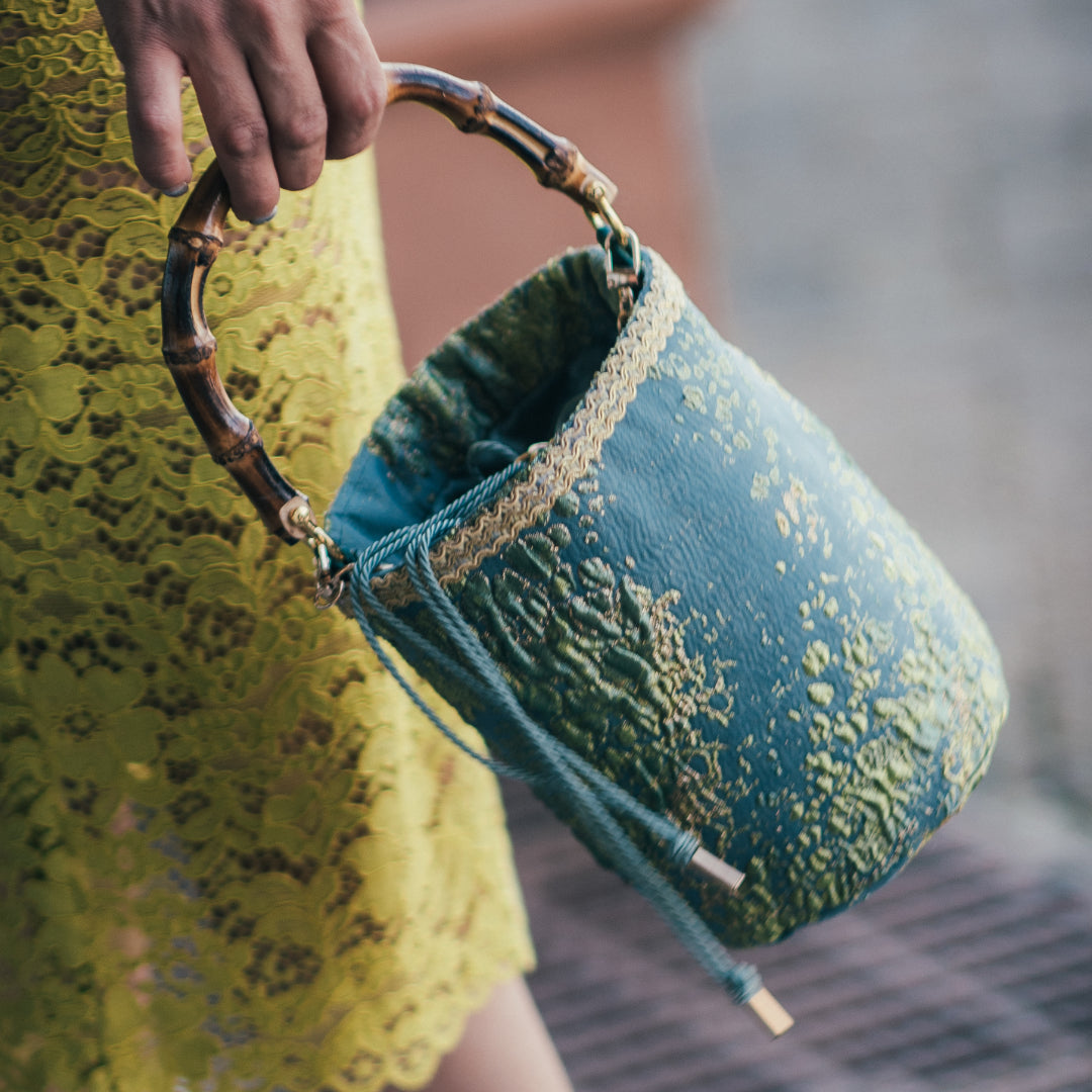 Realizzata in un raffinato broccato cloqué, ha il manico in bambù, l’interno in raso con coulisse in prezioso cordoncino ritorto e dettagli che si raccontano sottovoce.