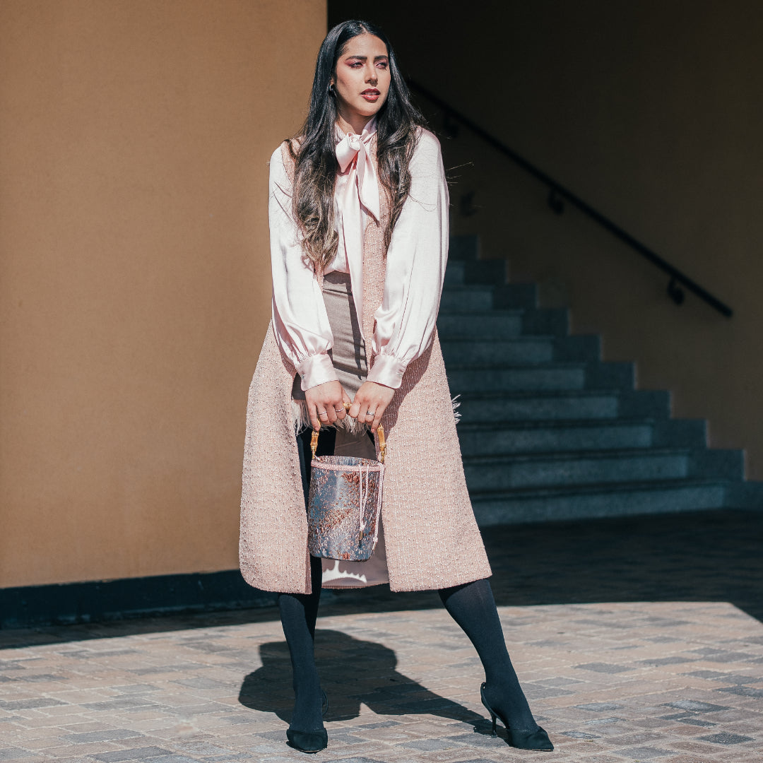 Realizzata in un raffinato broccato cloqué, ha il manico in bambù, l’interno in raso con coulisse in prezioso cordoncino ritorto e dettagli che si raccontano sottovoce.