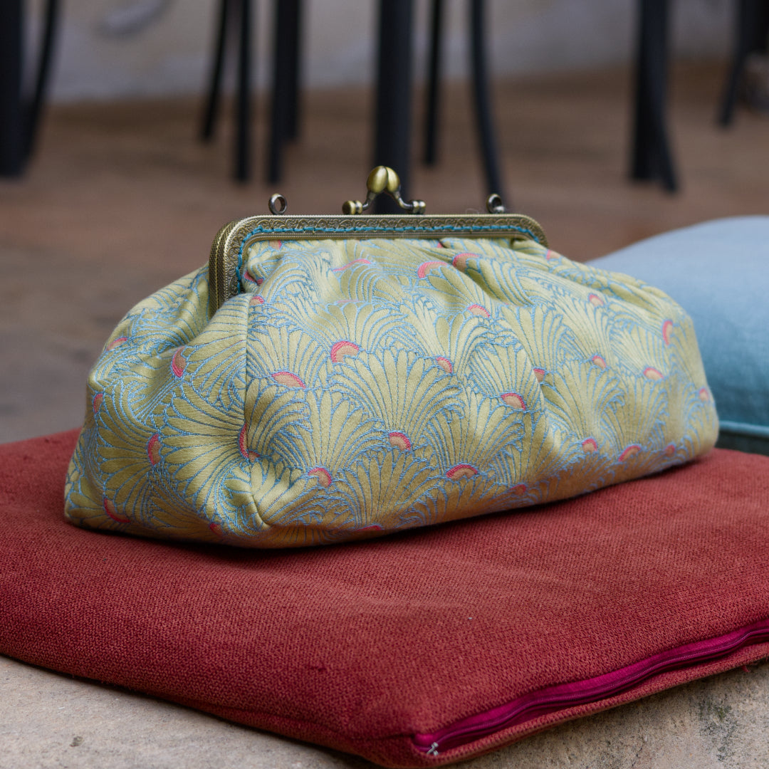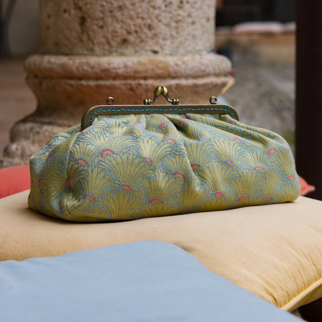 Chiusura kiss-lock anticata, tessuto prezioso con motivi floreali geometrici che ricordano le armonie giapponesi nei toni del crema, azzurro e salmone.