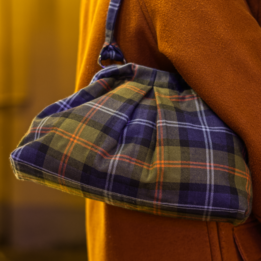 Realizzata in morbido e coloratissimo tartan di pura lana nei toni del verde blu e arancio, foderato in cotone stampato in fantasia, rigorosamente made in Italy di alta qualità. Fondo rigido.